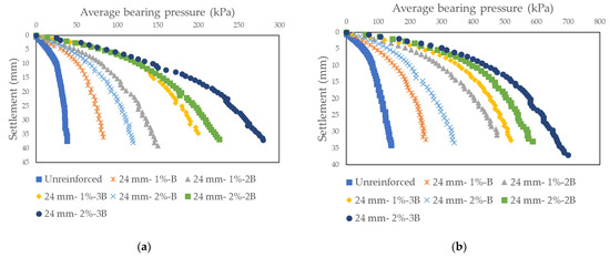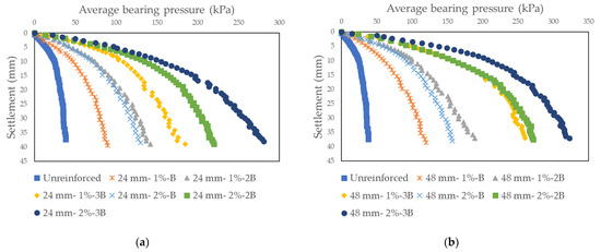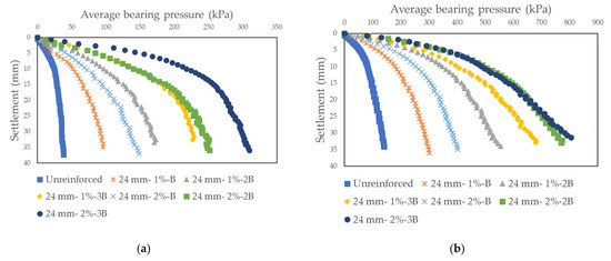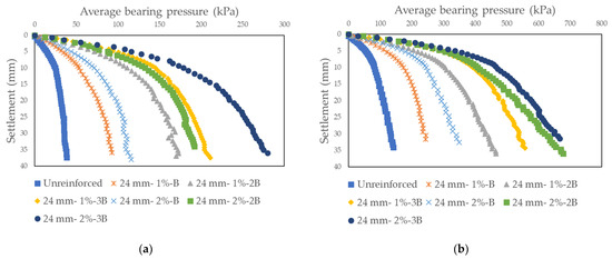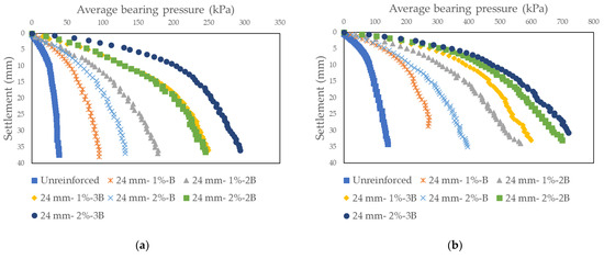 Average base pressure-settlement curves obtained as a result of model tests on sand soil randomly reinforced with basalt fiber: (a) Dr = 30%, Fl = 24 mm; (b) Dr = 50%, Fl = 24 mm.