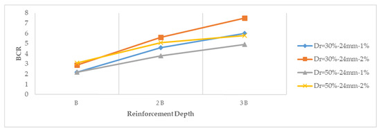 - For all fiber lengths and percentages at Dr = 30%, there was a 48–73% increase in BCR when reinforcement depth was changed from B to 2B, and there was a 30–52% increase in BCR when changed from 2B to 3B. At Dr = 50%, there was a 94–153% increase in BCR for all reinforcement lengths and percentages from depth B to 2B and an 11–23% increase in BCR from 2B to 3B. Changing the reinforcement depth from 2B to 3B at Dr = 50% had no effect on ultimate bearing capacity as much as the percentage increase seen at Dr = 30%.