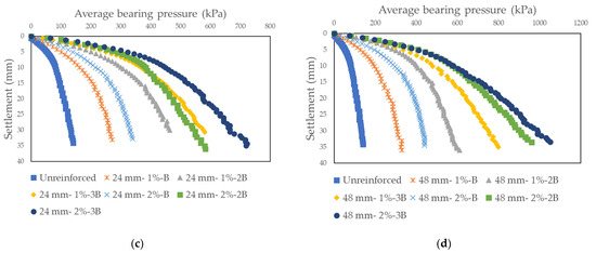 Average base pressure-settlement curves obtained as a result of model tests on sand soil randomly reinforced with macromesh fiber: (a) Dr = 30%, Fl = 24 mm; (b) Dr = 30%, Fl = 48 mm; (c) Dr = 50%, Fl = 24 mm; (d) Dr = 50%, Fl = 48 mm.