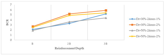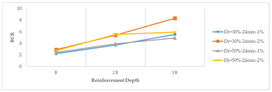 - For Dr = 50% Fc = 1% and 2%, basalt + macromesh fiber added experimental group showed an increase of 91% and 100% in BCR when the reinforcement depth was increased from B to 2B, respectively, but when the reinforcement depth was increased from 2B to 3B, the increase in BCR was 14% and −1.6%, respectively. As can be seen here, when the reinforcement depth is increased from 2B to 3B in the 1% fiber added sample, the increase in the bearing capacity ratio was very low, while there was no increase in the bearing capacity ratio when the reinforcement depth was increased from 2B to 3B in the 2% fiber added sample. In fact, there was a very small decrease. Based on this, it was deemed more appropriate to choose 2B improving depth in experimental groups with 2% basalt + macromesh fiber at 50% relative density.