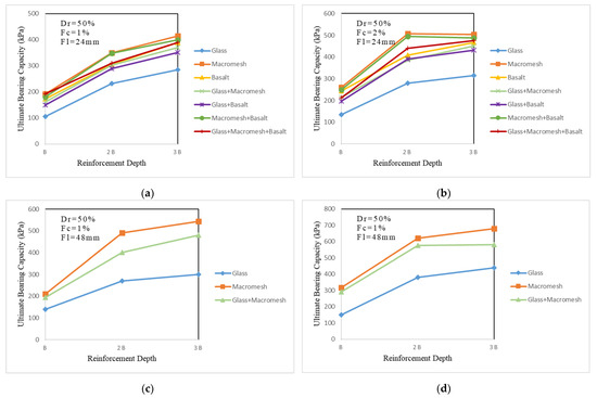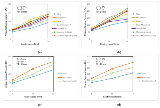 - When the reinforcement depth was changed from B to 2B and from 2B to 3B for all fiber lengths and percentages at Dr = 30%, the BCR increased by 69–101% and 28–33%, respectively. For all reinforcement lengths and percentages, the BCR increased at Dr = 50% by 53–135% from depth B to 2B and by −1.5–18% from 2B to 3B. The ultimate bearing capacity did not rise by the same proportion when the reinforcement depth was increased from 2B to 3B at Dr = 50%. Especially in the experimental group with Dr = 50%, Fl = 48 mm, Fc = 2% macromesh fiber additives, when the depth was increased from 2B to 3B, there was no increase in the bearing capacity.