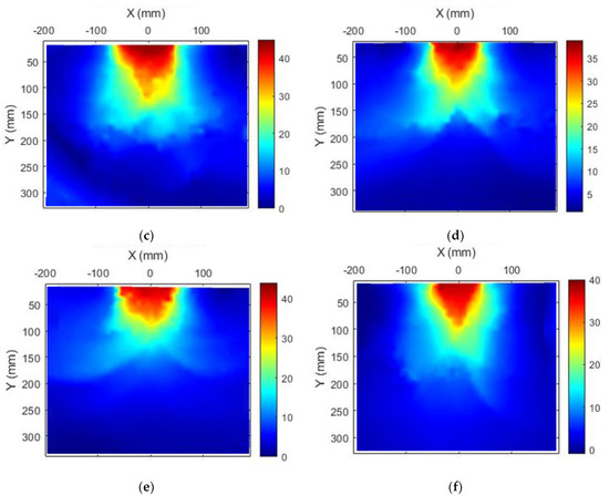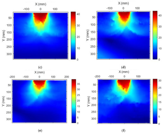 PIV results with Dr = 50%: (a,b) Unreinforced; (c,d); fiber content 1%; (e,f) fiber content 2%.