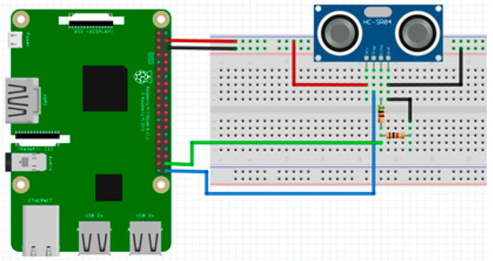 Schema of the proper connection between Raspberry Pi and the HC-SR04 ultrasonic distance sensor.