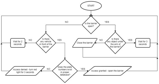 As mentioned before, the additional goal of this project was to check the possibility of basing the described system on free, open-source software. The final version of the developed system contains two scripts in the Python language. The first of them controls the overall action algorithm and the work of barriers and ultrasonic sensors. The second is responsible for the camera, image processing, character recognition, and comparing the results with the database. To carry out such a comparison, the SQLite API for Python was used. The databases used in the project were written in SQL. The schema of the algorithm of the first of the Python scripts is pictured in Figure 2.