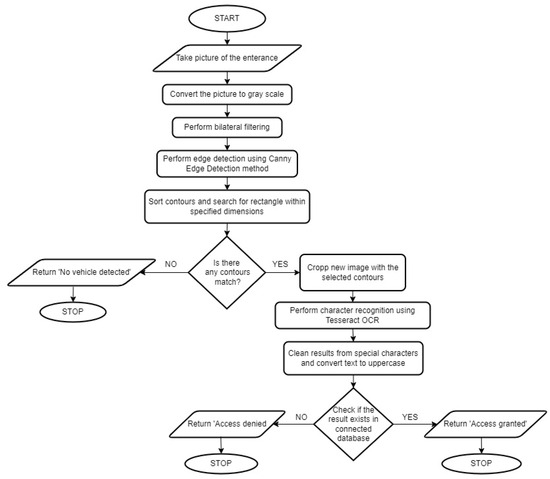 Most of the image processing is performed with the OpenCV library. The script converts the image to greyscale, reduces noise by performing bilateral filtering, detects edges using the Canny Edge Detection method, and tries to find objects that could be the licence plate. If the program finds such an object, it isolates it and performs character recognition with the Tesseract OCR engine. Because the individual photographed vehicle may be at a slightly different angle relative to the camera and the picture may be taken during different weather and light conditions, there is a high probability of some errors occurring; however, it is also possible to prevent some of them. The most common bugs are mistakenly adding special characters and using lowercase. None exist on the licence plates of any country, so the described script deletes all special characters from the results and changes every letter to uppercase. After these actions, the final result is compared to the specified database. The correct information is returned to the first script based on the consequences of the second script’s actions.