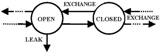 Two-compartment model representation (linear or nonlinear) illustrating one OPEN compartment, with a LEAK and a CLOSED compartment (no LEAK) exchanging material (solid arrows) with each other and possibly other compartments not shown (dotted arrows).
