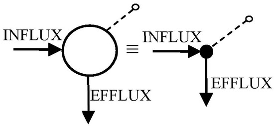 Circles are commonly used to represent compartments arrows to represent unidirectional transfers—which include inputs, influxes and effluxes (leaks)—and dashed lines, with a small open-circle endpoint, denote measured outputs (Figure 3). Directed graphs (digraphs) also are used to represent MC models, with nodes (vertices) representing compartments and edges as the arrows interconnecting compartments (nodes) or the environment, as in Figure 3. For linear systems, arrows and edges are typically represented by constant parameters (e.g., fractional transfer rates kij). For nonlinear systems, arrows and edges designate variable functions of constant parameters (e.g., A, B) and state variables qi (e.g., saturable functions, like A/(B + qi) [7].