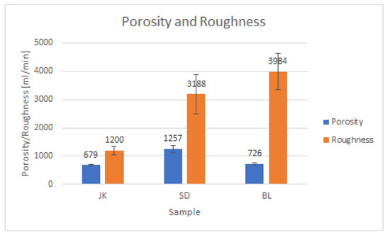Porosity and roughness measurement of the used alternative paperboards: JK—Japanese knotweed, SD—sawdust, and BL—black locust samples.