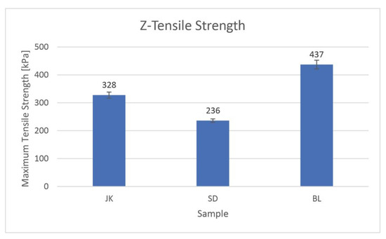 The results for the z-tensile strength of the tested paperboards: JK—Japanese knotweed, SD—sawdust, and BL—black locust samples.