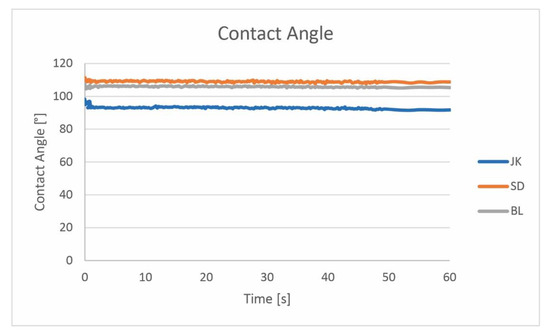 The dynamic contact angle of water droplets on the tested paperboards: JK—Japanese knotweed, SD—sawdust, and BL—black locust samples.