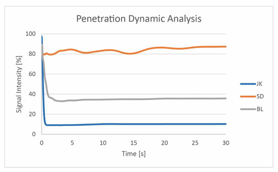 The penetration of the glue into the paperboard surface is important for the adhesive process. The contact angle shows the physicochemical interaction with no additional force moving the liquid part of the adhesive onto the surface. Since the standard paper porosity testing (e.g., Bendtsen porosity) often does not provide sufficiently precise results (due to the two-sidedness and inhomogeneity of paper), the ultrasound testing of penetration dynamics was performed. This measurement presents the interaction between the surface and the testing liquid (water + IPA) and reveals the real pore structure. The measurement is based on sending an ultrasound signal through the working liquid onto the surface, inducing signal drop due to the interaction of the liquid and the tested surface. According to Figure 5, the most porous structure is observed with sample JK, while sample SD has the most closed, non-porous structure. The higher shoulder of the measurement curve shows that the surface is more dense and hydrophobic (Figure 5). So the higher amount of long fibers (no alternative fibers) and larger size of the hydrophobic sawdust particles in combination with the entrapped air bubbles formed a denser liquid/paperboard interface which was harder to penetrate with the ultrasonic “push”. These results show the fine nuances between air permeability and porosity and the measurement techniques used for specific applications.
