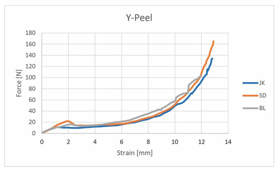 All three samples had the so-called mode M3 failure curve described in Korin et al. [1], on the other hand, they do not break completely within the specified maximum 3 mm displacement during testing. Several peaks are not uncommon, and they have a significant proportion of dissipative descending energy. The force is constant during the final part of the force–elongation curves. In fracture mode M3, the failure starts with small microcracks in the ascending part of the curve; the microcracks appear between the fiber matrix. In the descending part, a major crack has developed and this crack leads to final failure with fibers and the complete top part being torn off from the lower part of the paperboards without pulling the adhesive part. The strain curve for the Y-peel is shorter as the fracture happens often at the fixed part of the sample holder due to the low cohesion force of the basic paper materials in comparison with the cohesion force of the adhesive and fiber matrix. It has long been known that the tendency of a paper to delaminate in peeling can be very sensitive to the peeling direction, apparently reflecting whether the fiber ends are orientated up or down in the z-direction, which in turn is a function of the drag-to-rush ratio [26]. Comparing the Y- and T-peel adhesion strength test methods, the adhesive joint during the T-peel test is not fixed (is free to move), while during the Y-peel test the adhesive joint is fixed. During the Y-peel test, the sample is clamped with three points and the tester pulls the upper adhesive joint with constant speed. The sample stretches and, finally, the fracture of the sample happens. This is also the reason why the testing length (x-axis of Figure 7) is just a few millimeters.