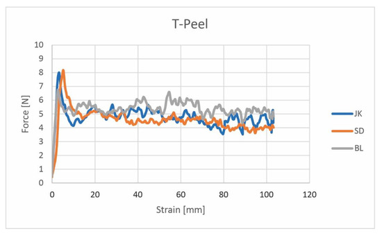 T peel force elongation results for all three paperboard samples: JK—Japanese knotweed, SD—sawdust, and BL—black locust samples.