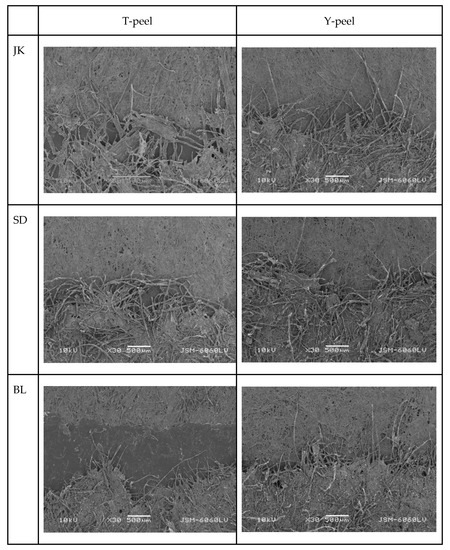 SEM images of Y- and T-peel samples: JK—Japanese knotweed, SD—sawdust, and BL—black locust samples.