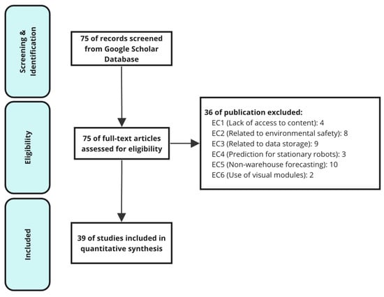 The papers were evaluated based on inclusion, exclusion, and quality criteria, which led to the selection of 39 publications out of the 75 found during the search process. The systematic literature review process is illustrated in Figure 1. Initially, 75 articles were identified from Google Scholar, with selections made based on the relevance of their titles and abstracts. After the exclusion criteria were applied, 36 articles were removed, resulting in 39 articles being retained for in-depth analysis.