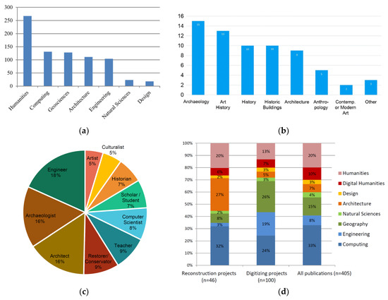 Users of 3D heritage data. (a) Participating disciplines, FSU Author survey (Figure [22]). (b) Project—disciplines, PURE 3D Survey 2020 (Figure: [29]). (c) Disciplines of respondents, VIGIE Survey 2021 (Figure: [23]). (d) Disciplines of article authors and co-authors, Conf. article review (Figure: [44]).