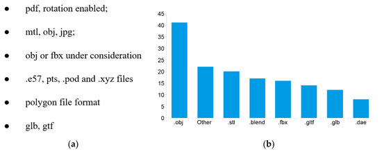 The 3D file formats. (a) Unweighted list of data formats, Europeana Survey [25]. (b) Data formats named as relevant, PURE 3D Survey 2020 (Figure: [29]).