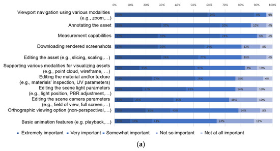 - Feature and quality requirements: The visual qualities of 3D web-based viewers have been discussed in various articles [30], with a notable trend to increase (photo) realism. However, these required visual qualities seem highly dependent on use cases. Regarding tools and functionalities, many application frameworks provided by public institutions are VREs that provide a complex working environment for particular communities, such as archaeology [127] or architectural history [128], but require much more experience. For general-purpose 3D viewers, low-level requirements, such as model viewing and viewport navigation, are considered extremely important [28,45]. Higher-level requirements include measurement and editing tools and the ability to show/hide parts of the model [24]. Consequently, viewer tools should be kept simple and focused on the most relevant features.