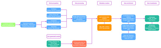 As of early 2023, the DFG 3D Viewer consortium has been operating two repositories. A semi-production system is operated by HS Mainz and is based on WissKI as a virtual research environment and linked open data management software [136]. This environment is used as a live system to store and deliver a unique model pool. As a second repository, we launched the Jena experimental repository for the DFG 3D Viewer in 2022 to test data aggregation, processing, and enrichment workflows in an experimental and fully controllable environment. It is based on a LAMP stack running in a dockerized VM. The processing pipeline includes various PHP and Python scripts. The overall processing scheme of the Jena experimental repository comprises components for “Data retrieval”, “Data processing”, “Metadata creation”, “Data enrichment”, and “Data visualization” (see Figure 6) and will be the subject of discussion in the next sections.