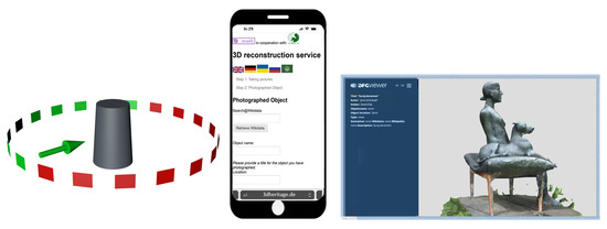 As an alternative method for gathering 3D content, we implemented a low-end 3D digitization pipeline for documenting heritage using images captured with a smartphone. The objective is to document cultural heritage by using images and 3D models from user-generated photos and to integrate them into our repository. The 3D reconstruction service includes a webpage frontend providing a guided workflow capturing and uploading images to the portal servers, together with metadata (see Figure 7).