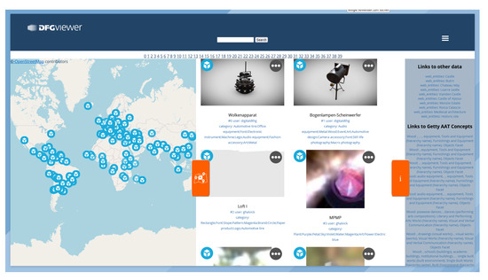 Various standards for 2D user interfaces have been established [161,162,163]. As a paradigm for interface design, we combined 2D maps (e.g., Google Maps [164] or OpenStreetMap [165]), historical images (e.g., Historypin [166]), and a keyword-based search across all content fields (Figure 9). Interaction with these elements triggers content filtering. The interface is written in plain HTML with JavaScript codes for interactions. We used OpenLayers [167] by adding map-based interaction functionalities.