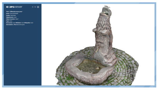 To be compatible with the multitude of extant and future infrastructures, the DFG 3D Viewer is designed as a modular system that enables the integration of various repositories, viewers, and services. This includes 3D data conversion, reconstruction, documentation, and metadata enrichment, and also the ability to link to other 3D model infrastructures in Germany, such as the Kompakkt viewer [132] or Virtual Research Infrastructures, such as FOSS [77] or the 4D Browser [133]. A range of services incorporated into the DFG 3D Viewer include export options for the conversion and parsing of metadata in container formats (including METS/MODS format) and converters for 3D data formats (e.g., OBJ/MTL, FBX, IFC, PLY, and XYZ) into the glTF format. The glTF format was chosen since it is widely supported by WebGL-based viewers and has numerous relevant features for browser-based viewing, such as single-file containers or progressive loading [134]. Previous articles have provided explanations of the overall project [100], as well as specific components, such as the metadata scheme [135] and usage scenarios [116].