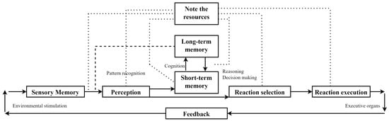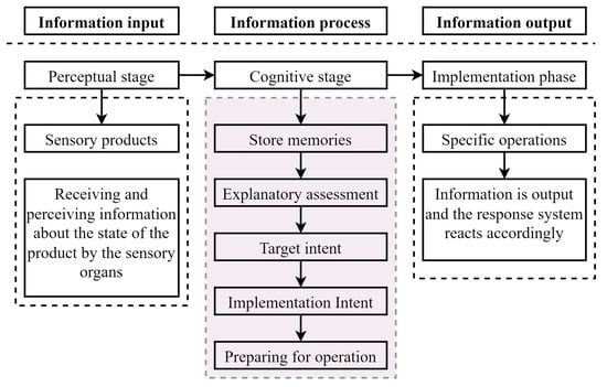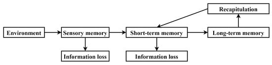 Information input, as the central part of the first stage, is the first step in the interaction behaviour of people and products, etc. People perceive external information primarily through their sensory organs, followed by the brain’s reaction and judgement. The human information processing process is divided into three stages: information input, information processing, and information output. The three-stage processing model of memory information can be divided into three categories: sensory, short term, and long term (as shown in Figure 2).
