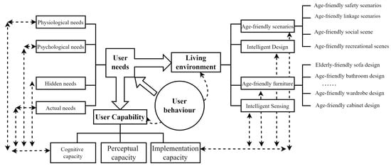 Distinguishing the traditional man–machine approach to studying the size of elderly furniture or elderly behavioural styles, this study innovatively constructs a theoretical model of age-appropriate home function–user living ability to form a mapping relationship between elderly home function and user ability. The method divides user capabilities into differentiated gradient ranges of capability deficiency, capability matching, and capability surplus ranges. It focuses on the theoretical model, matching process, and gradient construction of the matching function and needs of elderly users. The model can be divided into four modules, including the module of internet interaction environment, the module of life ability acquisition, the module of product function iteration, and the module of user ability construction gradient, and the four modules constantly interact with each other and iterate in order to achieve the goals of data collection, sustainable analysis, and iterative upgrading.