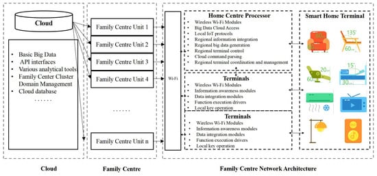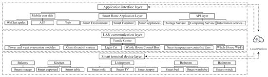 The smart home is a residential platform that integrates embedded technology, sensor technology, network communication technology, automatic control technology, and home facilities to accomplish intelligent control of home life, making it more efficient and comfortable. Infrared, Bluetooth, ZigBee (Purple Bee protocol), radio frequency (RF), Wi-Fi (wireless communication technology), and other short-range communication technologies, which can easily transmit the information collected by sensors to the IoT gateway, compared to wired communication, provide the conditions for the realisation of intelligent homes. In traditional IoT intelligent home control, APP (application) control is mainly used, but it is limited by problems such as long R&D cycles and expensive R&D costs. Therefore, this study’s intelligent home system, designed independently, mainly uses Wi-Fi to connect the smart gateway to the mobile phone and realises indoor intelligent control through the mobile phone applet designed and developed separately. Users can complete the click operation directly on the mobile phone, and the applet’s background, combined with the communication module, transmits the data to the central controller, which sends commands to the nodes, thus realising the control of intelligent terminals such as furniture or home appliances. The central controller refreshes the data at regular intervals by sending data requests to the sensor nodes, thus refreshing the sensor data. The architecture of the home intelligence system consists of three parts: the application interface layer, the LAN communication layer, and the intelligent device terminal layer. In general, the application interface layer is mainly open to users and includes the business logic layer architecture and the database; the LAN communication layer consists of the Wi-Fi-based device LAN, the home intelligent device master controller; the smart device terminal layer contains the control communication module, the sensor element or module, the control element or module, and the power supply.