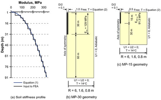 The numerical analyses presented here were undertaken using the finite-element program ABAQUS 2016 []. A two-dimensional (2D) axisymmetric pile geometry was considered, which comprised a 200 mm diameter micropile with a TA length of either 30 m (designated MP-30) or 15 m (MP-15), embedded in a domain that was either 91 m or 45.5 m deep, Figure 1b,c). Utilizing a 2D axisymmetric modeling approach provides notable advantages in computational efficiency, precision, and simplified configuration for geotechnical challenges exhibiting rotational symmetry, as exemplified by the case of piles and the soil domain. The thermally-activated part of the pile started 1.0 and 0.5 m below ground level for MP-30 and MP-15 respectively, to provide a buffer between the thermal boundary conditions applied in the pile and along the ground surface; this had only a minor effect on the reported pile behavior. This is a generic study, however, the pile lengths modeled are representative of typical micropile installations and also allowed the influence of the effect of the changes in geometry between the large diameter (LD) piles considered previously [] and the micropiles considered herein.