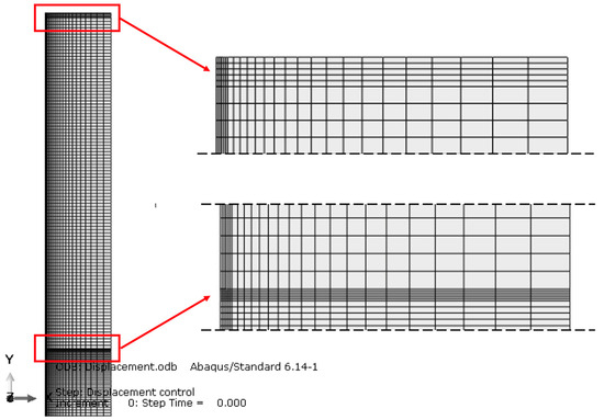 The model was discretized, as shown in Figure 2, by means of a mesh defined by 5421 quadrilateral elements of type CA4XT [], i.e., coupled temperature-displacement elements for which the stress analysis depends on the temperature solution and the thermal analysis depends on the displacement solution.