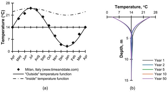 - Recognizing that the near-surface region of the ground is influenced by seasonal climate variations, in this stage, a transient thermal analysis was undertaken in order to establish the extent of this region. To achieve this, a periodic temperature function, Equation (2) and Figure 3a, was applied at the ground surface over a period of 10 years, which was found to be sufficient to establish a dynamic thermal equilibrium with the imposed boundary condition, Figure 3b.