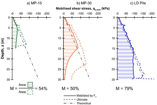 Figure 5 compares the shear stress mobilized on the pile–soil interface of the piles at the allowable and ultimate loads (y0/D = 25%). To allow ready comparison, the theoretical ultimate shear stress based on Equation (4) is also shown (dashed grey line):