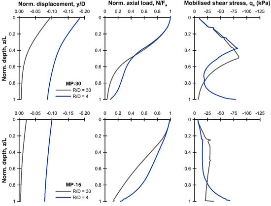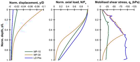 Figure 6 presents a comparison of the normalized response of the three pile cases, with the pile depth (z) normalized with respect to the pile length (L), the vertical displacement (y) by the pile diameter (D), and the axial load (N) by the allowable load, Fa. The vertical displacement profile again highlights the relative effect of elastic shortening—while the pile base settlement was comparable (<0.02D) between the three cases, the pile head movement of MP-30 was much greater and dominated by the elastic shortening. The differences in the axial load-transfer and shear stress profiles were also a consequence of the relative values of elastic shortening, with the profile for MP-30 showing that most of the load transfer was completed in the upper half of the pile, with little load passing to the base.