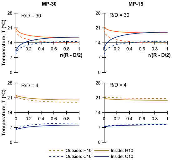 Radial temperature variation at mid-depth of micropiles (z/L = 0.5) from cycle No. 10 at peak heating and peak cooling, MP-30 top, and MP-15 bottom.