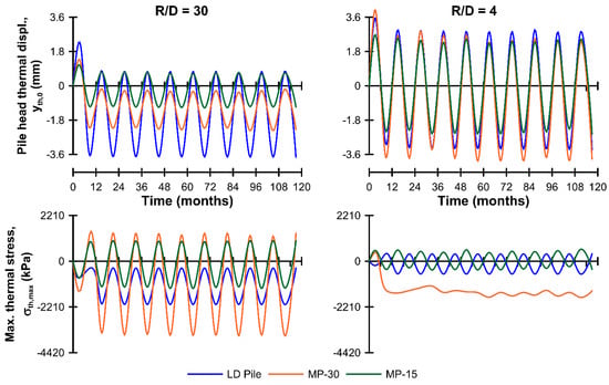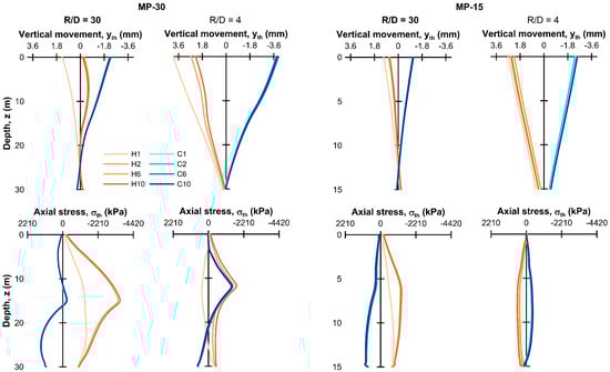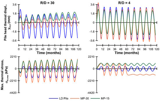 Figure 9 and Figure 10, and Table 3 and Table 4, compare the predicted cyclic thermal response of the micropiles as a function of length (30 and 15 m) and spacing (R/D = 30 and 4), with the “outside” surface temperature boundary condition maintained. For comparison, the free thermal expansion of the pile, yth,free (= αΔT L) was 3.6 and 1.8 mm, for MP-20 and MP-15 respectively, and the maximum thermal stress assuming perfect axial fixity, σth,fixed (=αΔT Ep) was 2210 kPa, where α is the coefficient of linear thermal expansion for the pile (Table 1), ΔT the maximum imposed temperature change (±12 °C), L is the pile length, and Ep is the pile effective stiffness (Table 1).