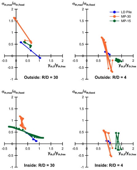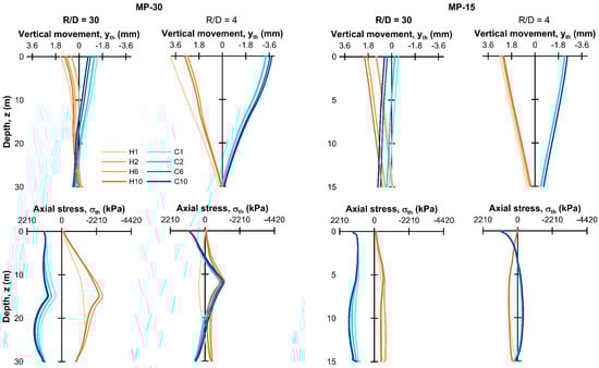 Examining in more detail the response of the two micropile cases, it was observed that during cooling cycles, downwards (negative) axial thermal displacements occurred in all cases, though of differing magnitude—larger downward pile head movements occurred at closer pile spacing which even exceeded yth,free due to the thermal activation of the ground, as discussed in Section 3.2. During heating cycles, there were marked differences which were most obvious for the isolated MP-30 case: here, in the first pile heating, the pile head expanded upwards and the base downwards as expected; in subsequent cycles, however, the upwards expansion was restrained and the resultant thermal movement was downwards (settlement) with respect to the start of the thermal activation of the pile (this effect is further discussed below, in relation to the thermal stress response). At the pile base, on the other hand, the thermal movements were small (± a few tenths of a millimeter, Table 3) and in line with expectations, i.e., downwards during heating and upwards during cooling. This led to significant nonlinearity in the profile of axial thermal movements for the isolated MP-30 case shown in Figure 9a. This effect was still present for MP-30 at R/D = 4 but was much smaller due to the more extensive thermal activation of the surrounding ground. The effect also appeared to be present in the isolated MP-15 case, but due to its shorter length, axial restraint was reduced, and the effect was not so obvious. This response had a direct impact on the axial thermal stress, as will be discussed below.