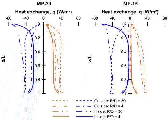 The effect of pile–pile thermal interference is apparent, with total heat exchange and the difference between “outside” and “inside” conditions reducing as R/D reduced. Heat exchange became practically null for MP-15 when R = 0.8 m. In practice, micropiles tend to be used in groups with close absolute spacing (even if the relative spacing is large), so the conditions that lead to the apparent loss of heat transfer efficiency will be the subject of further study, to define how to optimize the distribution of TA micropiles within foundations.