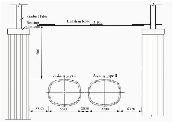 The cross-section of the concealed excavation section is shown in Figure 1. The horizontal clearance between pipe jackings I and II is only around 2.05 m, and the designed depth of the jacking tunnel is 15 m. The pipe jackings will pass through the viaduct piles’ neighboring region, the normal advancement area, the entrance and exit reinforcement area, and the single-ring pipe junction, which is 2 m long and has a total of 41 ring segments.