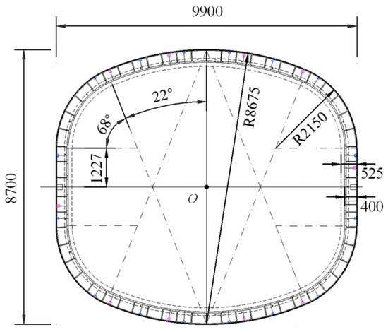 A novel type of “steel pipe section + concrete lining” composite pipe jacking is used to suit the needs of the pipe jacking method for big cross-sections and deep soil covering construction under soft soil layers. All structural steel pipe sections are utilized during transportation and construction, and when the pipe jacking has passed through, concrete is put to the interior of the pipe. Only half as heavy as a concrete pipe section (measured as a 2 m ring), a single steel pipe section weighs roughly 48 t. As depicted in Figure 2, the composite pipe jacking has an outside diameter of 9900 mm, a width of 8700 mm, and a height of 8700 mm. The wall thickness is 525 mm, of which the steel pipe section is 400 mm thick, and the concrete is 125 mm thick.