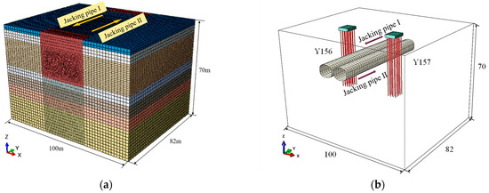 The size of the soil model is 100 m × 70 m × 82 m (X × Z × Y), and the overburden depth at the top of the pipe is assumed to be 15 m. The Z-direction displacement is fixed at the bottom, the front and back sides are fixed for the Y-direction displacement, and the left and right sides are fixed for the X-direction displacement. The model grid division is shown in Figure 3a. The model consists of two pipe jacking tunnels. Pipe jacking I’s excavation direction is along the Y-axis’s negative direction, the initial excavation surface at Y = −82 m (41 ring pipe section), and pipe jacking II’s excavation direction is along the Y-axis’s positive direction, the initial excavation surface at Y = 0 m. The horizontal distance between the two pipe jacking tunnels, which are built in parallel and then one after the other, is just about 2.05 m.
