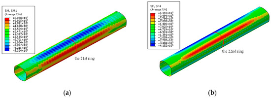 Figure 4 shows the overall internal force cloud diagram of the pipe section for Case 1. Each one-ring pipe portion before and after the model is eliminated for study because the pipe section close to the model’s boundary is where the stress concentration exists. From the bending moment diagram, it can be seen that the negative bending moment basically appeared at the top of the tube, while the positive bending moment appeared at the shoulder and foot of the arch. The 21st ring pipe section’s arch shoulder had the highest positive bending moment of the jacking pipe, which was 803.8 kN·m, and the 21st ring’s arch top had the highest negative bending moment, which was −532.4 kN·m. At the arch foot of the 22nd ring, the shear force reached its highest value of 419.2 kN. The maximum bending moment and shear moment were located in the middle of the tunnel structure, so the deformation of the pipe section in this area should be paid attention to during the tunnel construction and operation. During the construction of the pipe section, the maximum axial force is always located at the first pipe section behind the pipe jacking machine, which is due to the section influence of the jacking force and the oncoming resistance, resulting in the stress concentration in the pipe section at this location.