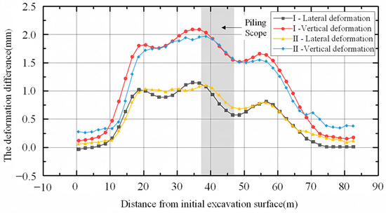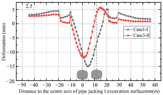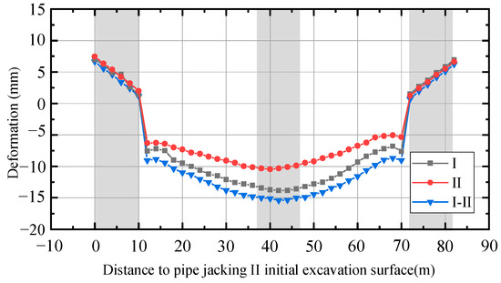 In order to show the influence area of the pile foundation on pipe section deformation more intuitively, the deformation difference of each position is plotted in Figure 7. The influence range of the pile foundation on the pipe section is mainly in the range of about 1D behind the pile foundation in the direction of jacking, and the maximum influence position is near the boundary of the pile foundation range. Under the influence of the pile foundation, the maximum reduction of the horizontal diameter of the pipe section of pipe jacking I is about 5.1%, and the maximum reduction of the vertical diameter is about 5.6%. The pipe section in pipe jacking II is reduced by 11% and 9.6% of horizontal and vertical diameters, respectively, compared to the pipe section in Case 1 due to the stacked influence of pile foundation and pipe jacking I.