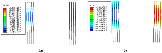 According to Figure 11, the horizontal displacement values along the depth direction (Z-axis’s negative direction) of the third pile in the left and right group piles are extracted, respectively. When pipe jacking I is finished being built, the maximum value of the pile foundation displacement on the left side is located above the pipe jacking’s range of vertical diameter, while the maximum value of the pile foundation displacement on the right side is situated within that range. Because the deformation of the pile foundation is mainly caused by the deformation of the surrounding soil layer due to the construction of the pipe jacking, the deformation of the soil body near the side wall of the pipe section is the largest. And once pipe jacking II is built, the maximum value of horizontal displacement of the pile foundation on both sides will be situated inside the pipe jacking tunnel’s range at a depth of around 17 m. Due to the fact that 28 m is the interface between the upper and lower soil layers, and the lower soil layer is more robust and difficult to disrupt, the horizontal displacement suddenly decreases at this level.