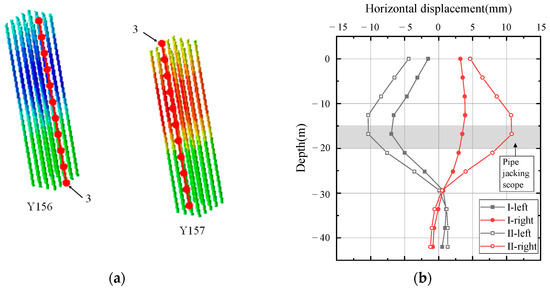 Horizontal displacement of pile foundation when pipe jacking is completed. (a) schematic diagram of pile foundation, (b) variation of horizontal displacement of pile foundation with depth.