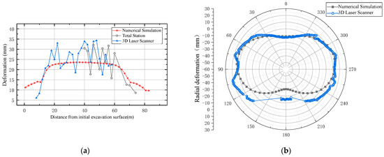 As of the completion of the building of pipe jacking I, the lateral and radial deformation curves of pipe sections along the jacking direction are compared with the outcomes of total station and 3D laser scanning, as illustrated in Figure 12. The results of the numerical simulation are essentially consistent with the measured values obtained from 3D laser scanning and the total station, and the results of the pipe section radial deformation are also largely consistent, which further verifies the applicability and accuracy of the simulation results.