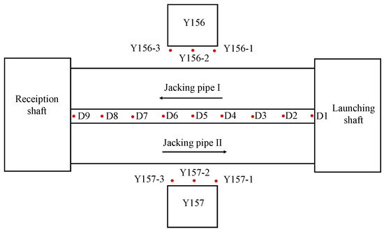 A Trimble DiNi03 electronic static level is used for the automated monitoring of the surface settlement at the center axis of the two tunnels and within a certain width on both sides. Starting from the starting shaft, nine monitoring sections are laid along the jacking direction, with a spacing of about 10 m, and the measurement points are numbered as Di, where i is the ith monitoring section, and Di (i = 1 to 9) is arranged directly above the central axis of the channel and the central axis of the two tunnels. In the distance from the viaduct abutment near the pipe jacking side of each of the three soil-deep lateral displacement monitoring holes, the hole depth longer than the abutment buried in the ground is 3 m, that is, the soil tilt hole depth is about 45 m, as shown in Figure 13.