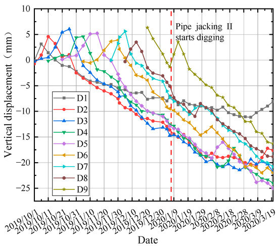 The time curve of uplifting and settlement for the measurement locations D1 to D9 is shown in Figure 14, where a positive value denotes uplifting, and a negative value denotes settlement. Each measuring point’s deformation may undergo a process of bulging and then settling. After pipe jacking I was completed on January 6, and the construction of pipe jacking II began, the curve once more displayed an uplifting trend. According to the monitoring data, the maximum ground settlement is larger than the simulation result, which may be due to the untimely filling of the gap between the back of the lining and the cave body after the shield passed through the section, resulting in the release of the ground stress and causing ground settlement.