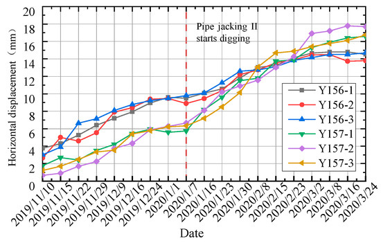 After the completion of pipe jacking I, the maximum horizontal displacements of the soil body of the soil on the left and right pile sides are 9.5 mm and 6.6 mm, respectively. After pipe jacking II begins to dig, the displacement of the soil body of Y156 on the right side rises more quickly. The maximum horizontal displacements of the soil 20 mm under the piles on both sides are 15.7 mm and 17.4 mm, respectively, and the construction of the pipe jacking II has a greater influence, which is consistent with the simulation results. After construction is complete, the final horizontal displacements of the piles on both sides are essentially the same.