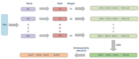 The next step is feature weighting. In this process, the algorithm considers the weight of each feature, which can be derived in several ways; for example, the widely used TF-IDF (term frequency–inverse document frequency) algorithm [24] is often employed to calculate weights. TF-IDF is a common algorithm in text mining that quantifies the importance of a word in a document relative to its frequency in a larger corpus. The ‘TF’ part measures the frequency of a word in a document, and ‘IDF’ reduces the weight of words that appear frequently across many documents, thereby ensuring that common words like ‘and’, ‘the’, etc., do not unduly influence the analysis. The weight reflects the importance of the feature in the text. The higher the weight, the greater the influence of the feature when generating the SimHash value.